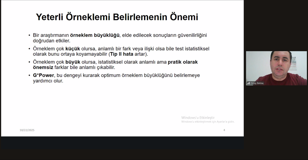 Etkinlikte, araştırmalarda örneklem büyüklüğü belirleme, istatistiksel güç analizi kavramı ve G-Power programının uygulama adımları detaylı şekilde anlatıldı. Prof. Dr. Oktay Bektaş, katılımcılara örnek çalışmalar üzerinden G-Power yazılımının etkin kullanımına ve örneklem hesaplanmasına dair örnekler sundu. Toplam 116 katılımcının yoğun ilgi gösterdiği etkinlik katılımcıların Prof. Dr. Bektaş’a yönelttiği soruların yanıtlanmasıyla sona erdi.