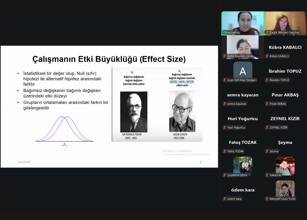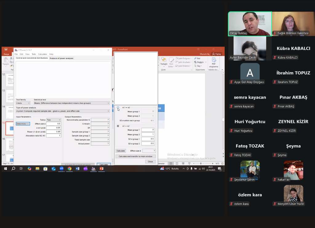 Sağlık Bilimleri Fakültesi tarafından Prof. Dr. Ayfer BAYINDIR ÇEVİK moderatörlüğünde çevrim içi “G*Power (Güç) Analizi” etkinliği, 22 Ekim 2025 tarihinde saat 20.00’de yoğun katılımla gerçekleştirildi. Etkinliğe, alanında uzman Prof. Dr. Oktay Bektaş konuk konuşmacı olarak katıldı.
